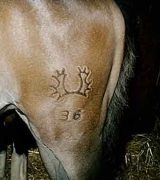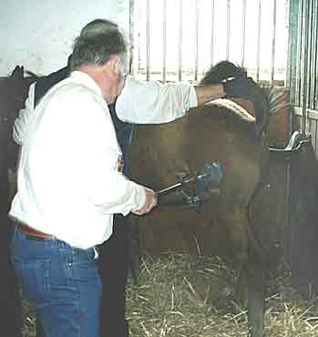 Bevor eine Stute eingetragen wird, muß sie gemessen werden - Frau Sander bestimmt den Röhrbeinumfang.